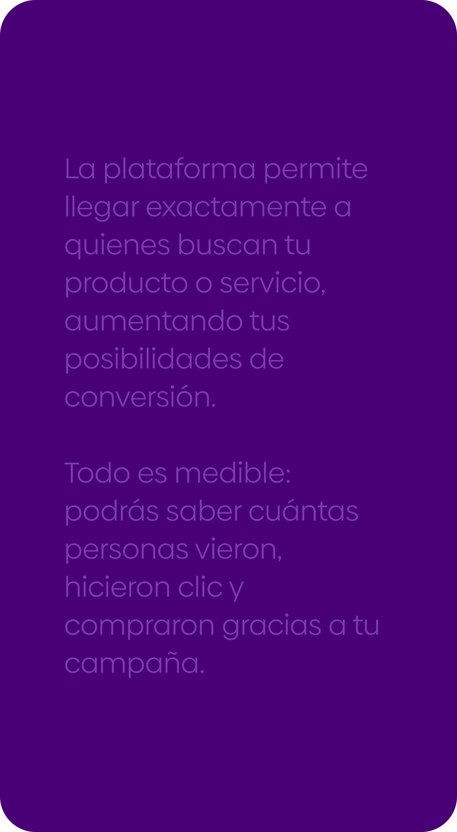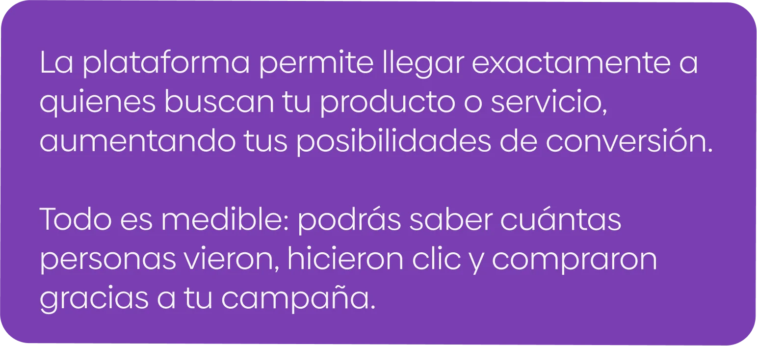 Impulsa tu marca con campañas que aparecen justo cuando tus clientes buscan lo que ofreces.