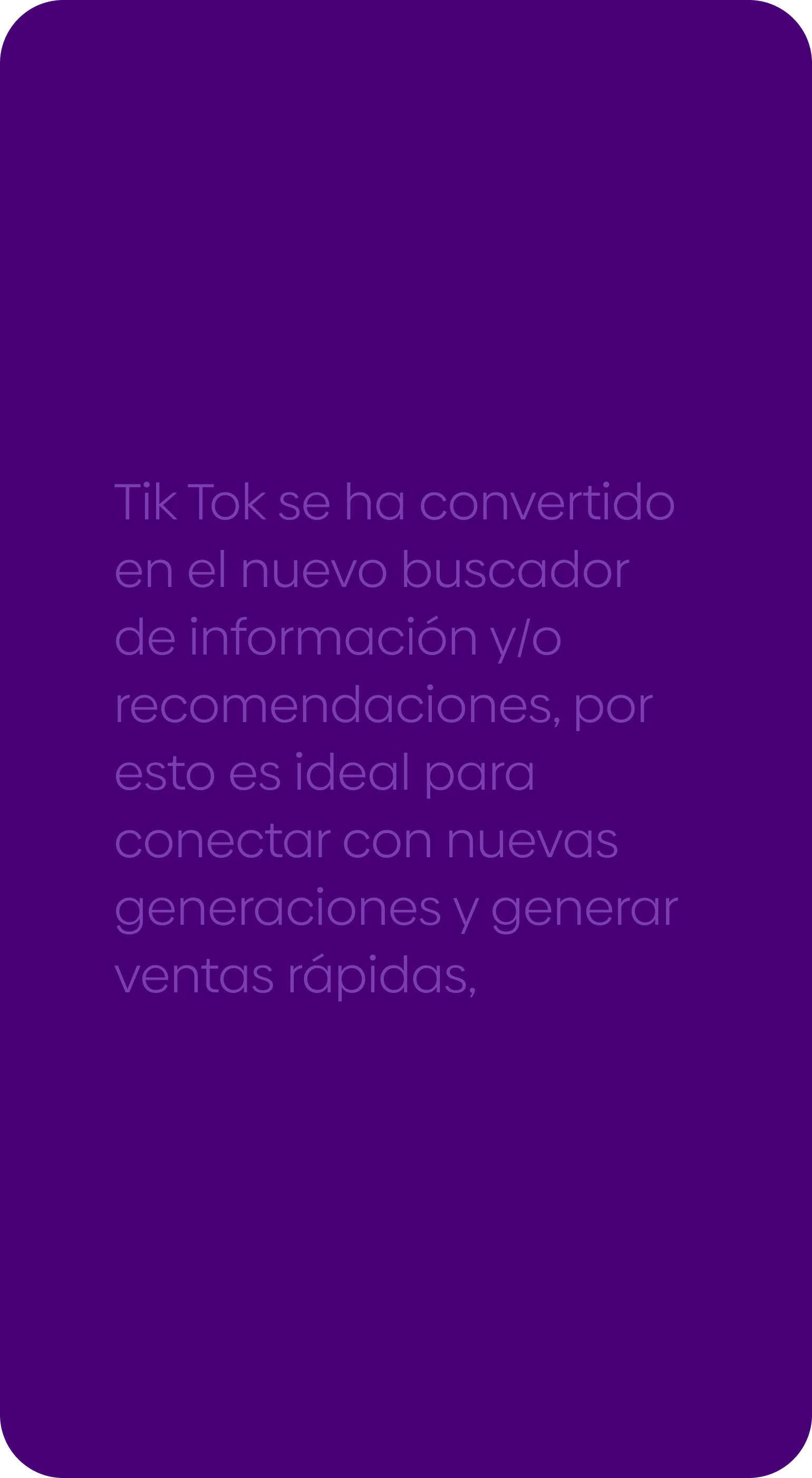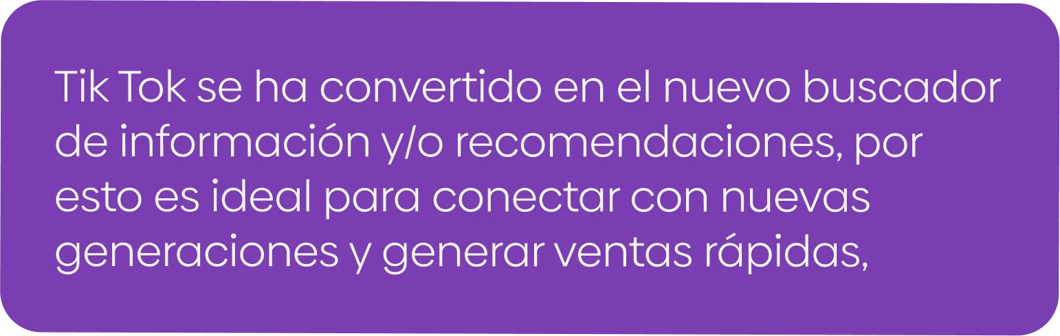 Meta Ads (Facebook + Instagram): Ideal para negocios que buscan consolidar comunidad, generar confianza y convertir a través de diferentes formatos (carruseles, stories, reels, formularios, etc.). TikTok Ads: Perfecto para marcas que quieren ser virales, conectar con audiencias jóvenes y generar un impacto rápido con contenido creativo y disruptivo.